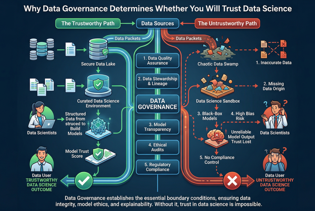 What explains this stark difference? Brous and Janssen argue that data governance acts as a boundary condition for trustworthy data science. A boundary condition, in their definition, is a socio‑technical constraint that must be satisfied before you can trust a data science outcome (Busse et al., 2017). In other words, no matter how sophisticated your algorithm, if you have not governed your data properly if you do not know who owns each dataset, if quality is not measured, if privacy compliance is not enforced then decision‑makers will, quite rationally, withhold their trust.